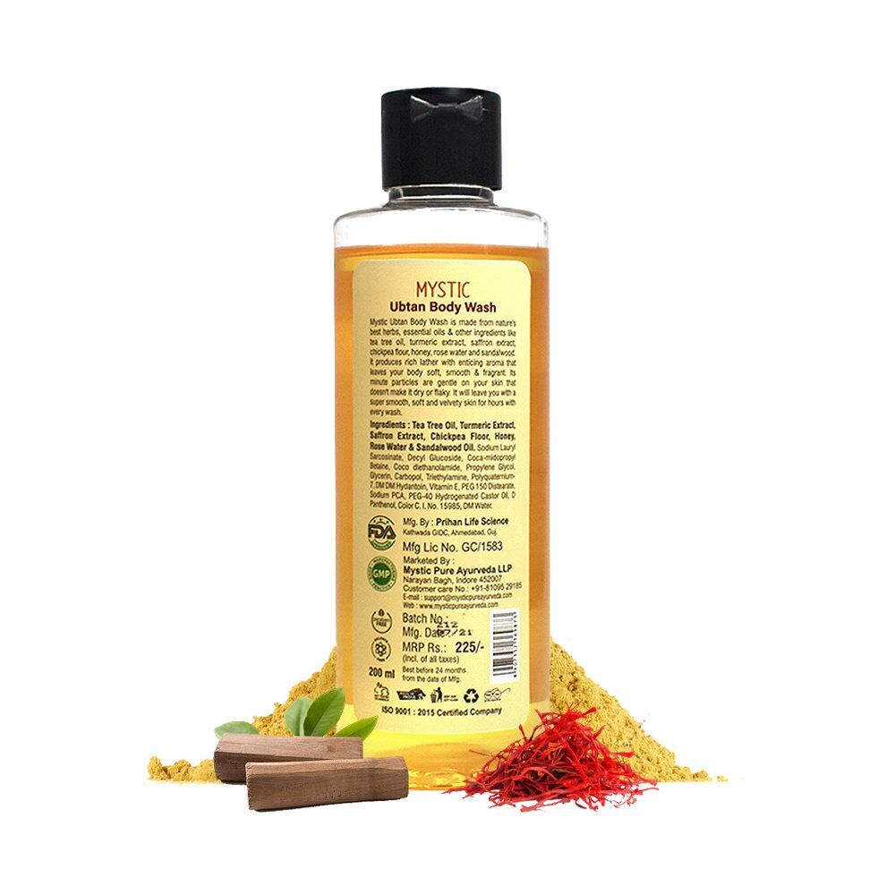 Mystic Ubtan Body Wash is made from nature’s best herbs, essential oils & other ingredients like tea tree oil, turmeric extract, saffron extract, chickpea flour, honey, rose water and sandalwood. It produces rich lather with enticing aroma that leaves your body soft, smooth & fragrant. Its minute particles are gentle on your skin that doesn’t make it dry or flaky. It will leave you with a super smooth, soft and velvety skin for hours with every wash.