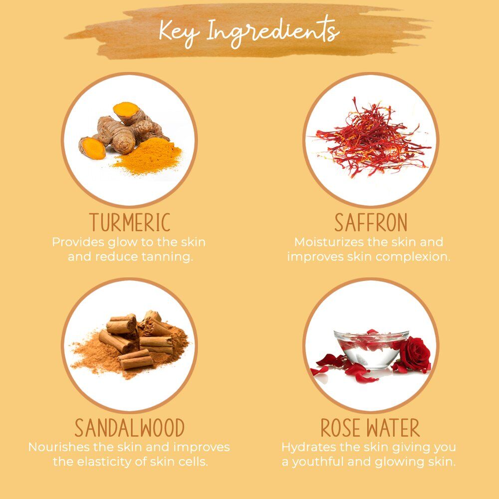 Key Ingredients: Turmeric extract, Saffron extract, Chickpea flour, Honey, Rose water & Sandalwood.