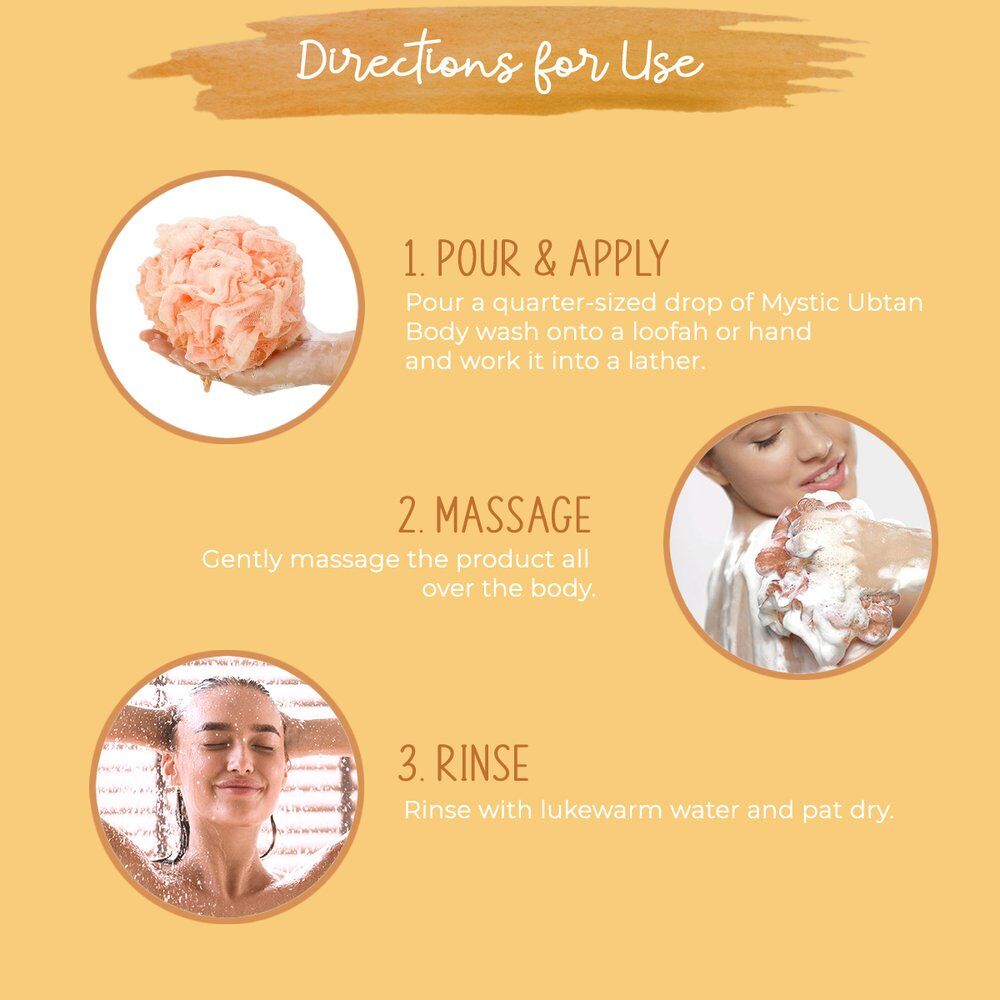 Directions: Pour a quarter-sized drop of Mystic Ubtan Body wash onto a loofah or your hands and work it into a lather. Gently massage it yourself all over the body and then rinse.