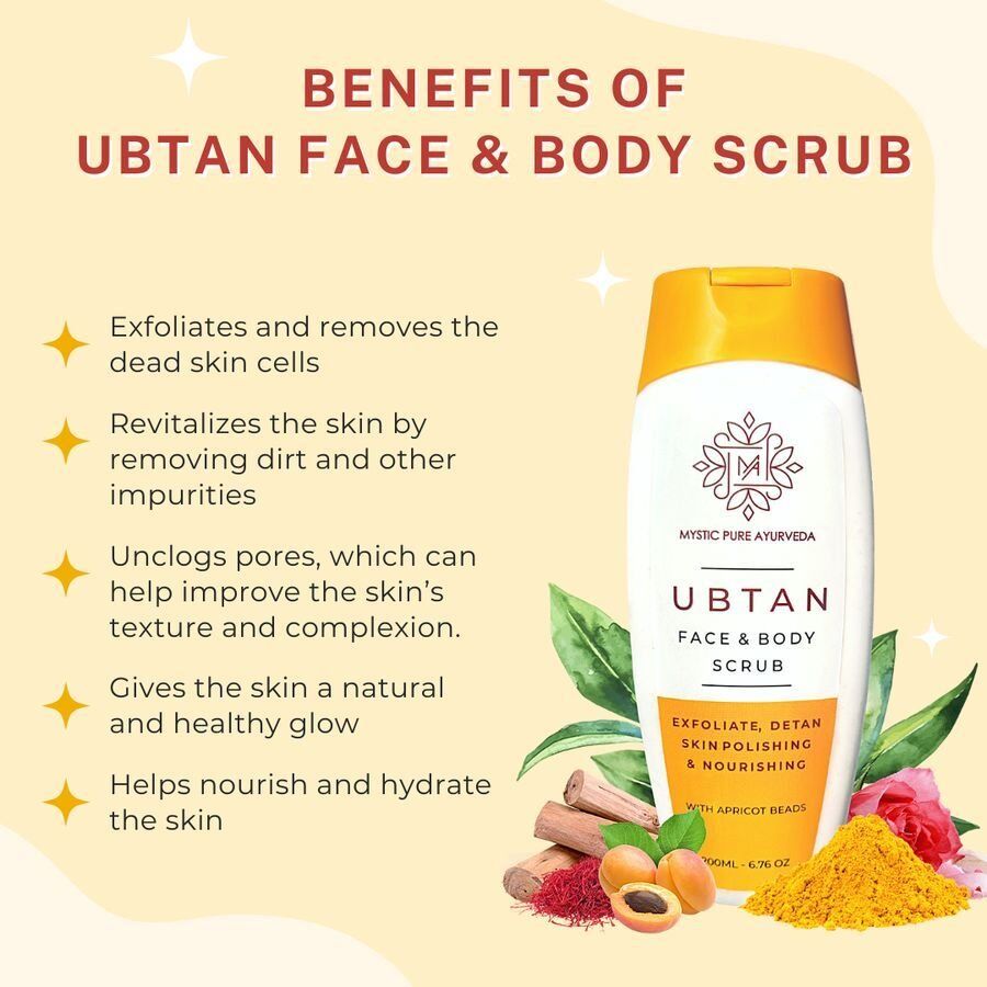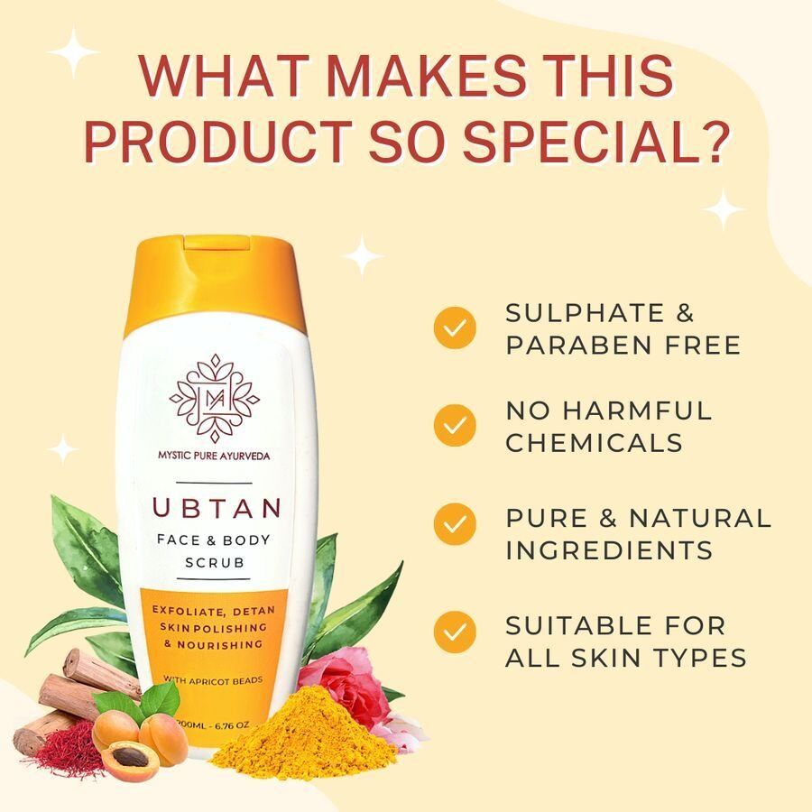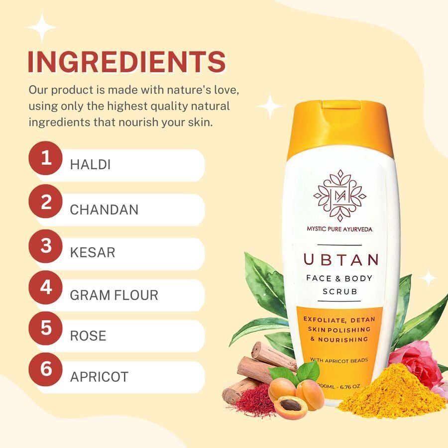 Mystic Pure Ubtan Face and Body Scrub is made from ancient indian formulation, using nature’s best herbs, essential oils & other ingredients. It’s scrub particles help remove dead skin, dirt and impurities, these particles are gentle on your skin. It helps remove tan, hydrates the skin and prevents dryness of skin. It deeply cleanses the skin along with enticing aroma that leaves your skin soft, smooth & fragrant. Suitable for all skin types.